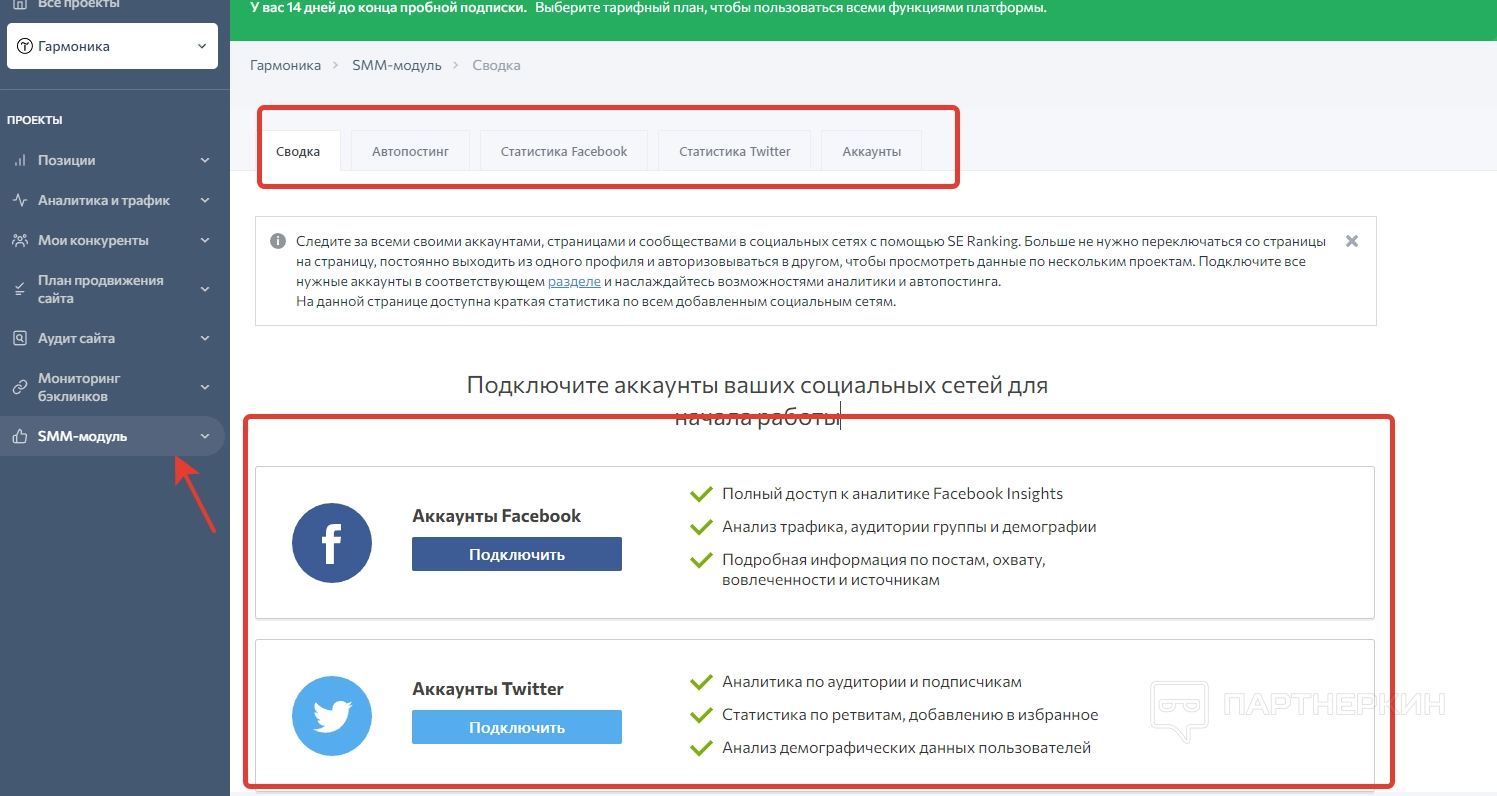 7. SMM-модуль . Тут можно найти инструменты для продвижения страничек в Facebook* и Twitter.