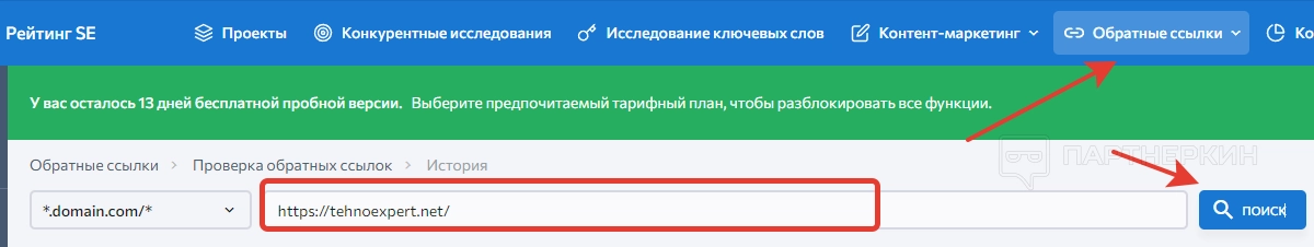 6. Мониторинг бэклинков . Здесь добавляются и отслеживаются бэклинки сайтов.