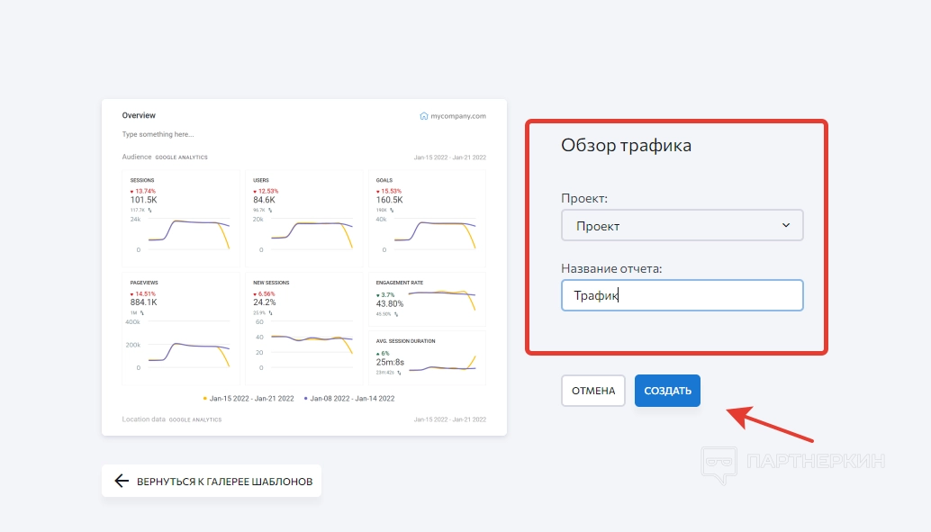 Создадим отчет на примере шаблона «Обзор трафика». Для этого выбираем соответствующий шаблон, открываем страницу, указываем добавленный проект и вписываем название отчета.