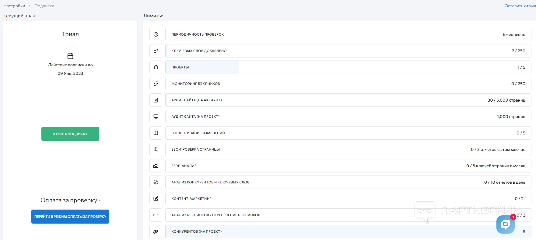 - подписка — отображается выбранный тариф и его лимиты;
