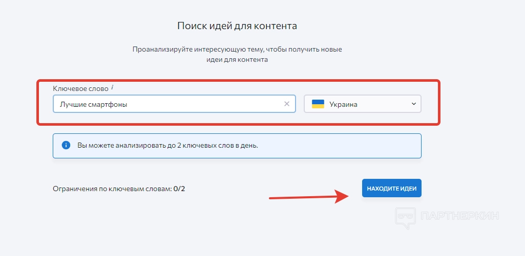 Далее переходим во вкладку «Поиск идей для контента», где можно отыскать полезные материалы у конкурентов. Чтобы начать поиск, указываем ключевое слово или фразу, выбираем ГЕО и кликаем на соответствующую кнопку.
