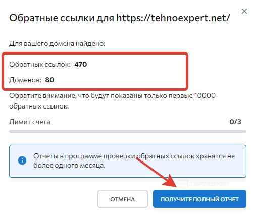 Когда пользователь кликнет на кнопку поиска, на экране отобразится форма, где будет количество обратных ссылок, число доменов и кнопка «Получить полный отчет».