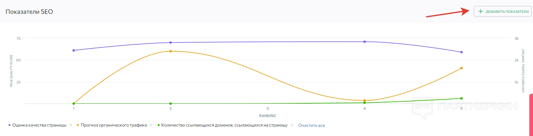 Первый блок — «Показатели SEO». Там в виде графика отображается оценка качества страницы, прогноз органического трафика и количество ссылающихся доменов на страницу. При необходимости показатели можно добавлять, для этого в правом верхнем углу присутствует специальная кнопка. Добавить можно: