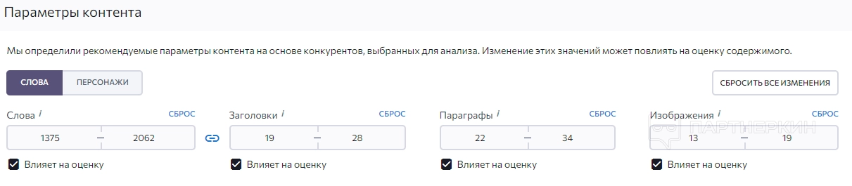 - число символов на странице и основном контенте;