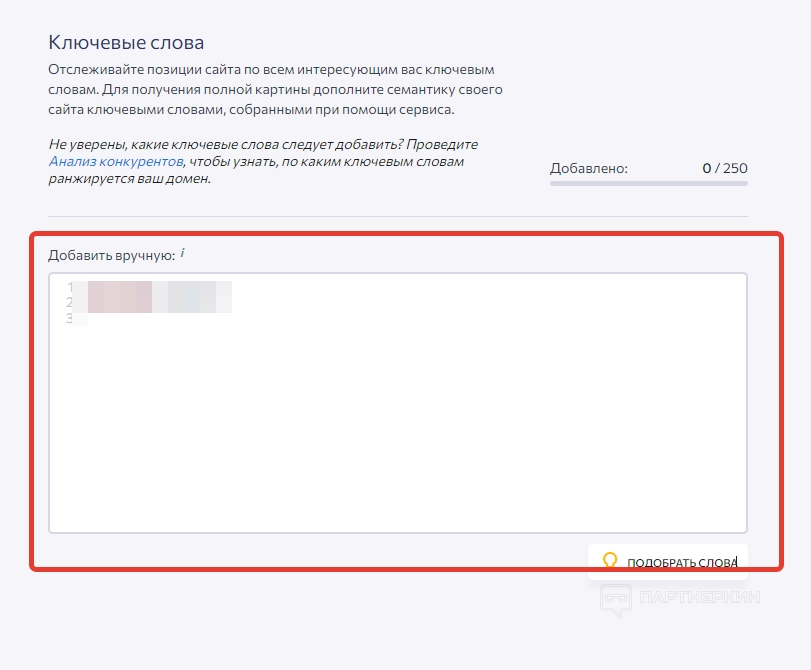 2. Ключевые слова . Здесь вставляем ключевые слова, по которым хотим отслеживать веб-ресурс.