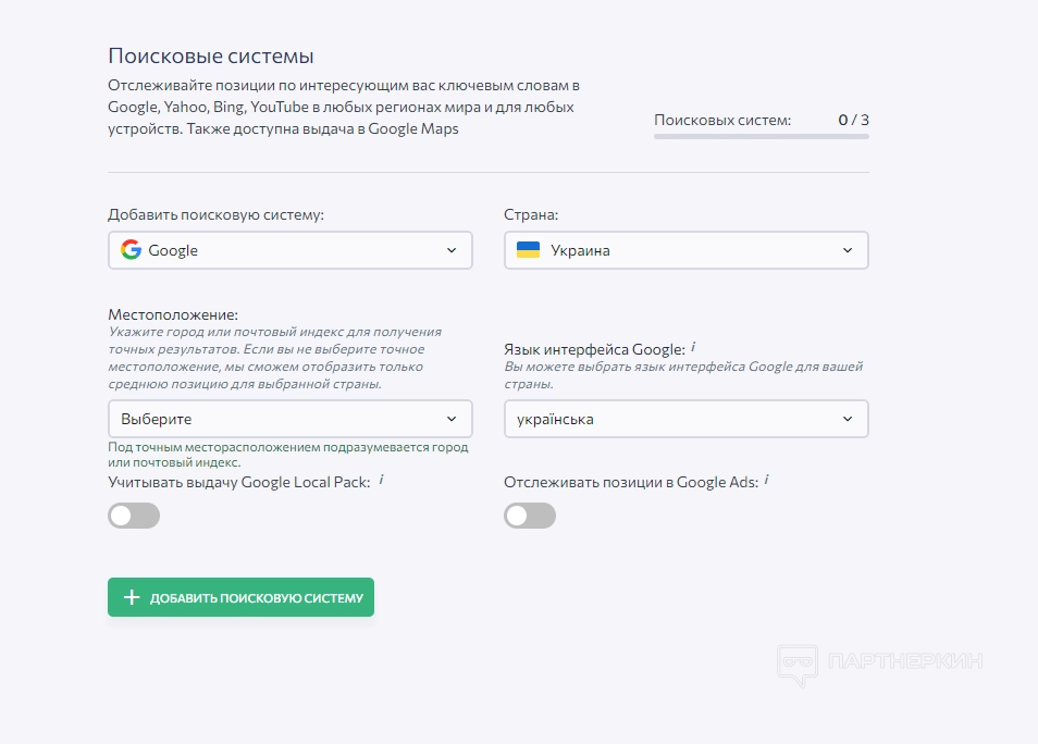 3. Поисковые системы . Выбираем поисковые системы, по которым будет отслеживаться указанный сайт. Также можно выбрать ГЕО, местоположение и язык интерфейса.
