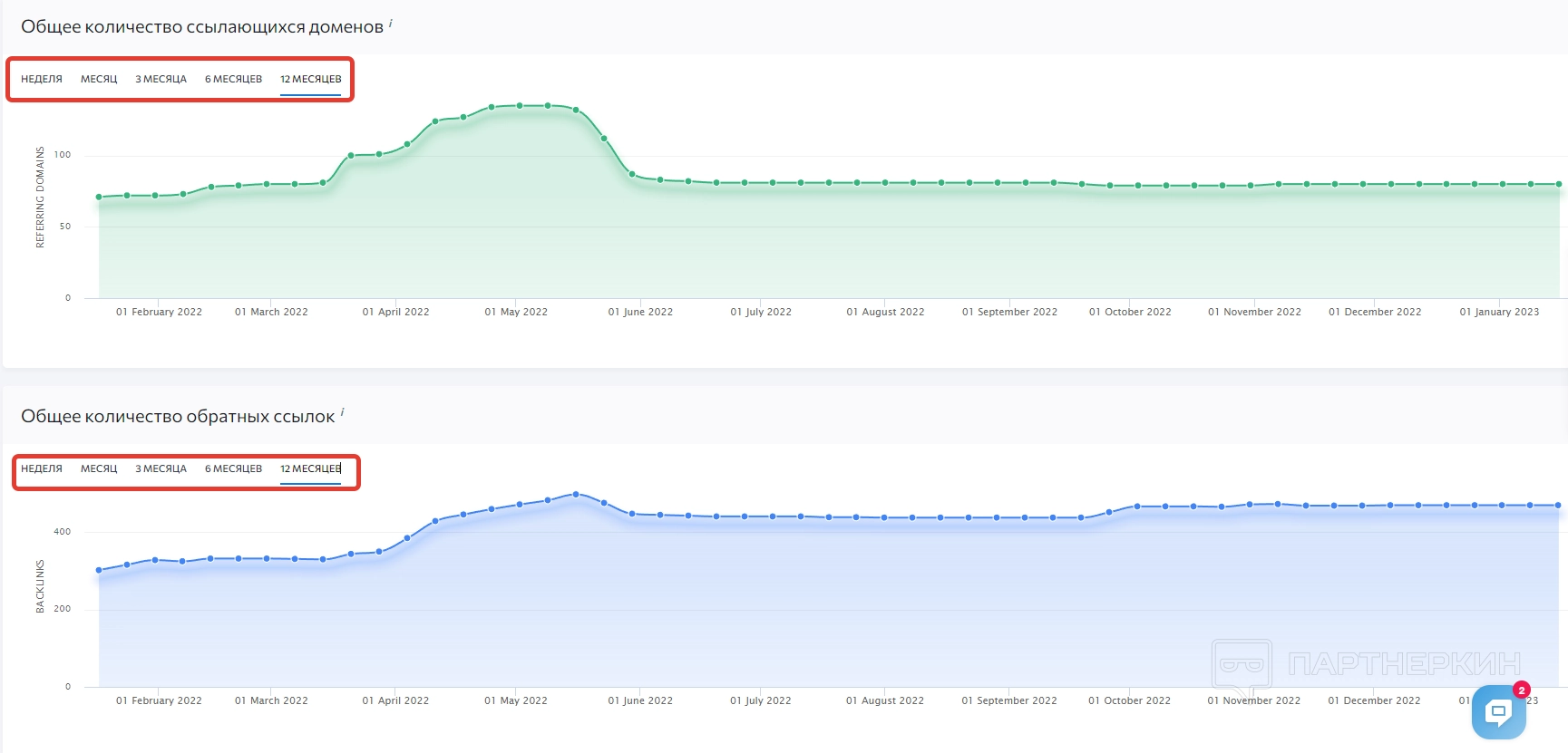 Ниже идут блоки с общим количеством ссылающихся доменов и обратных ссылок. Вся информация из них отображена в виде графиков. Период можно выбирать в соответствующей строке.