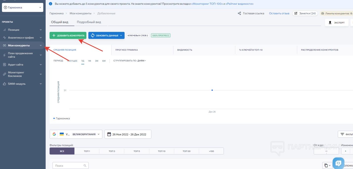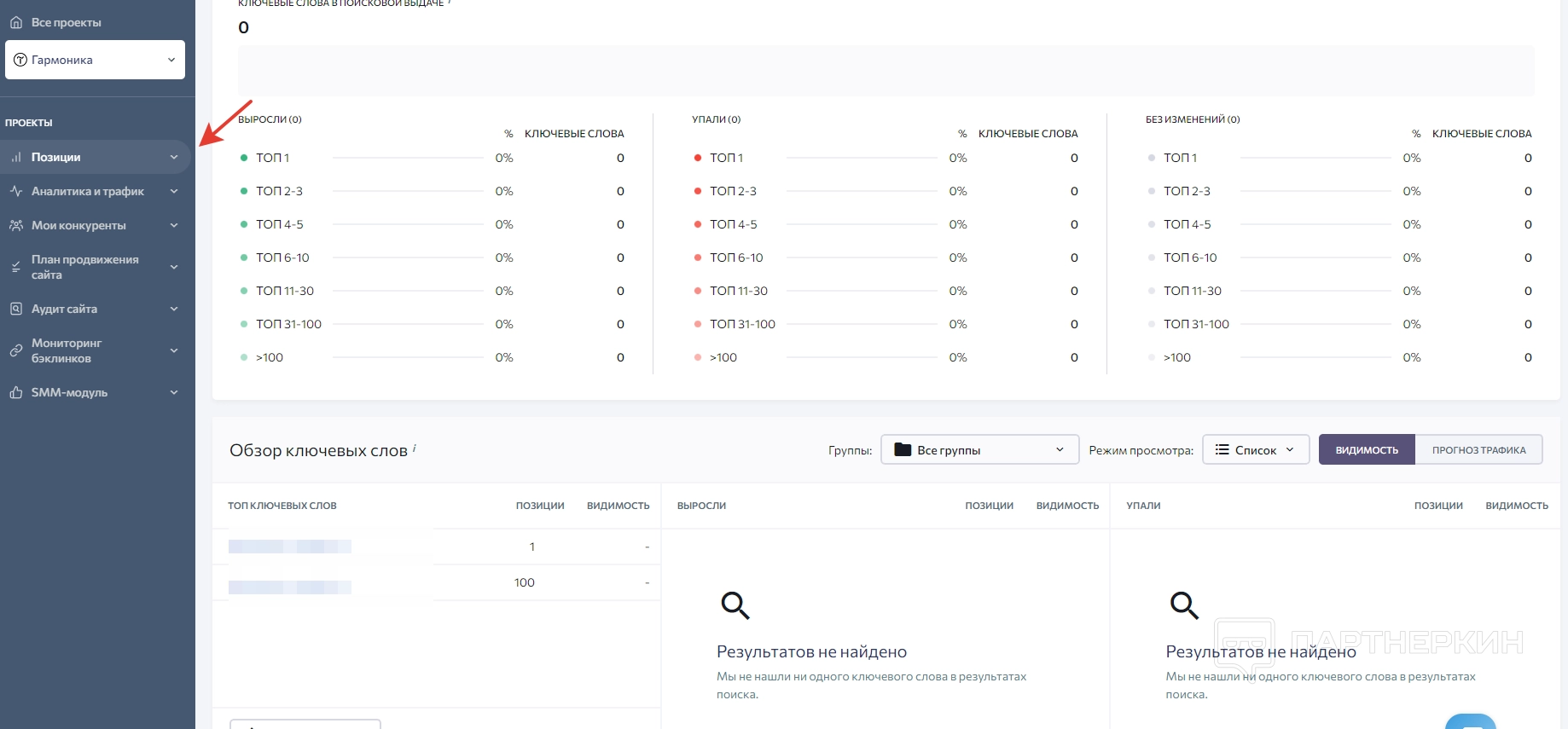1. Позиции . В этой вкладке отображается вся информация, связанная с позициями сайта в выбранных поисковых системах.