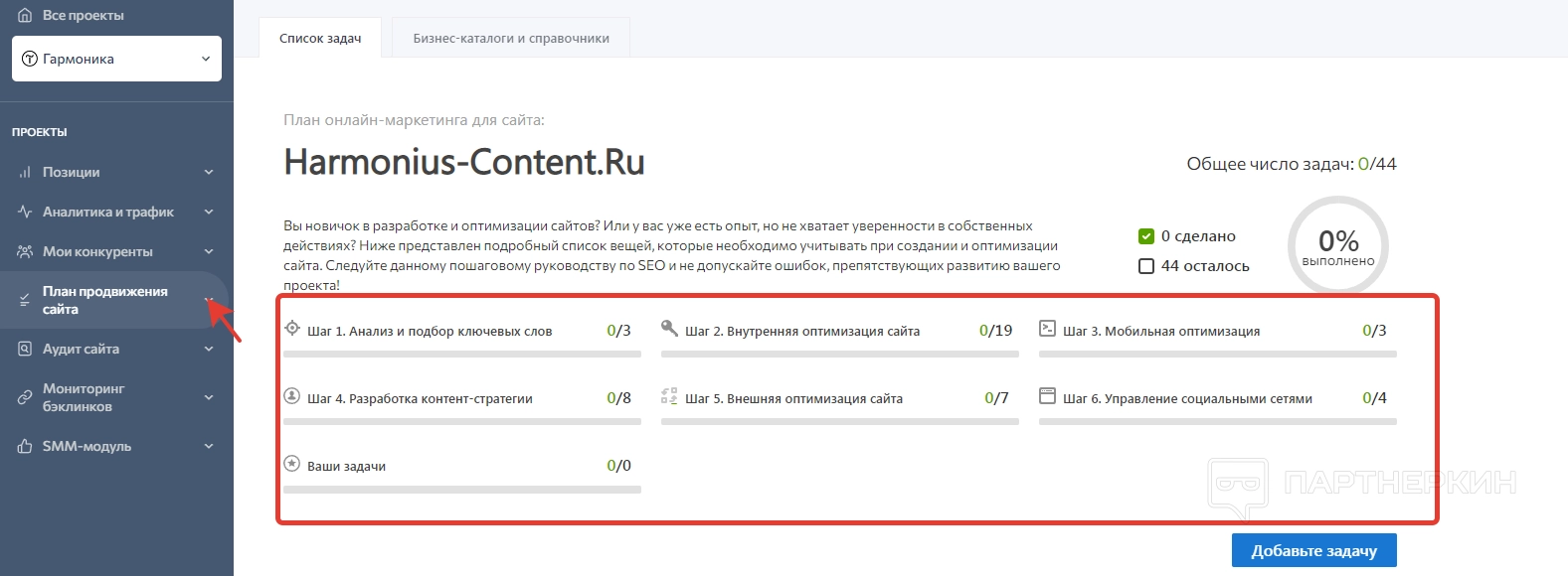 4. План продвижения . Это вспомогательный блок, в котором можно составить дорожную карту для продвижения своего проекта. Система по умолчанию предлагает 6 шагов.