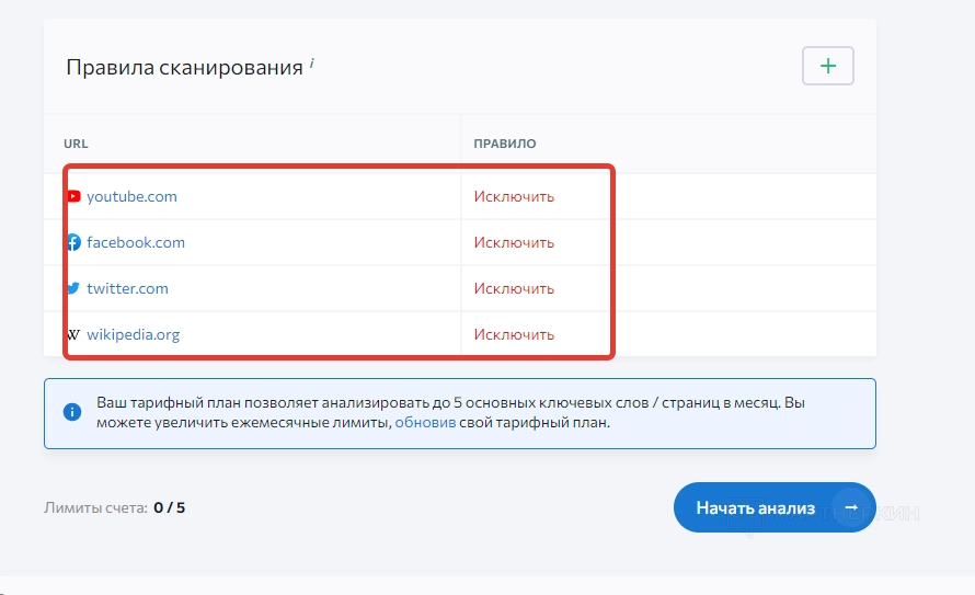 В нижнем блоке можно исключить определенные площадки, в которых не будет осуществляться поиск.