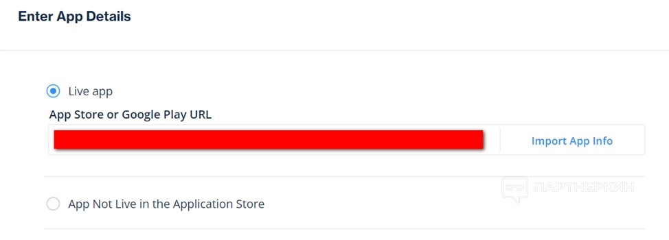 - Выполните настройки. В первом блоке добавьте ссылку из маркетплейса на готовое мобильное приложение (Live app) или создайте прилку с нуля (App Not Live in the Application Store).