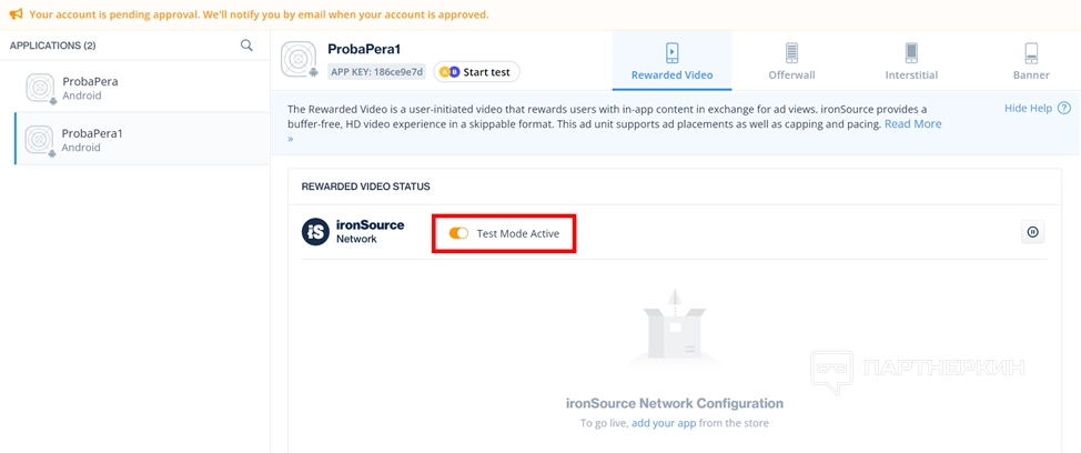 - На почту придет сообщение с подробными настройками. Пока можно запустить монетизацию для продукта в тестовом режиме. Нажмите Test Mode Active.