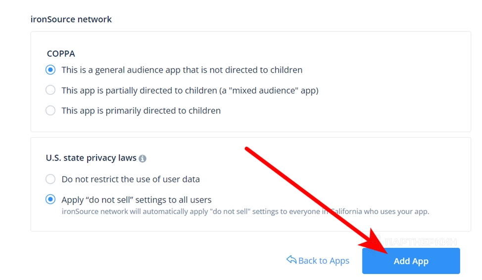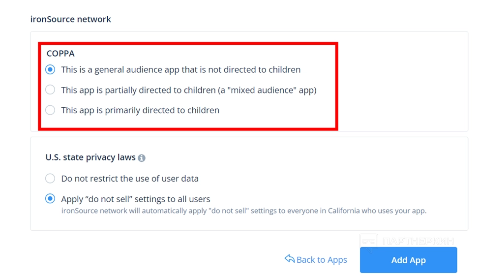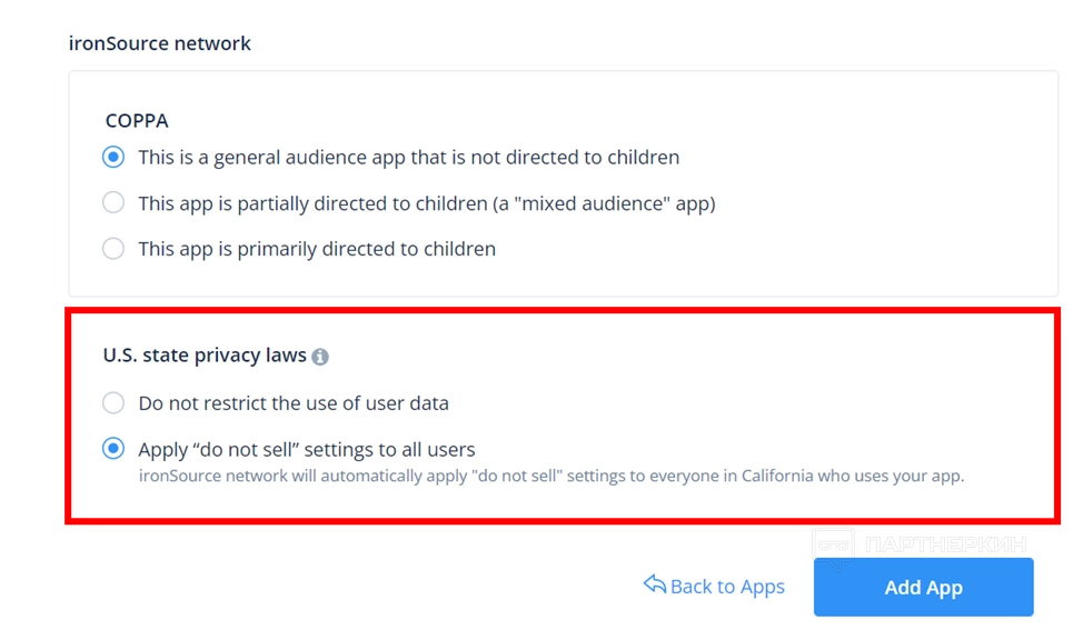 - Блок U.S. state privacy laws дает возможность выбрать тип законодательства, под которое сделано приложение. Для ограниченного количества пользователей или для всех.