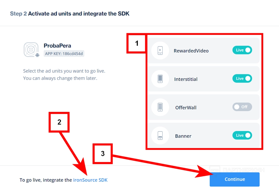 - Выберите тип рекламы (1), по желанию выполните настройки SDK (для разработчиков) (2), нажмите на Continue (3).