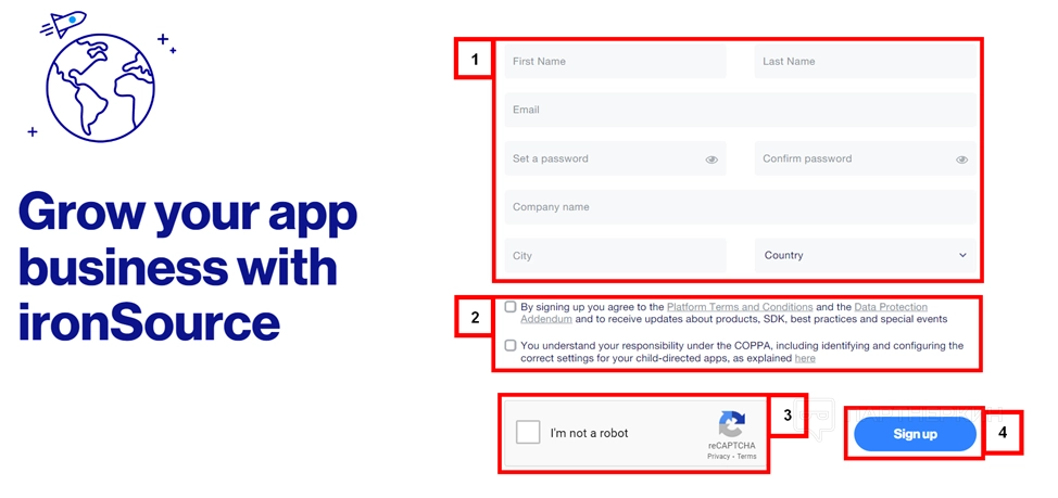 - Заполните форму, где укажите свои контактные данные и придумайте пароль (1), установите галочки, которые подтверждают, что вы ознакомились с правилами сервиса (2), пройдите капчу (3), нажмите Sign UP (4).
