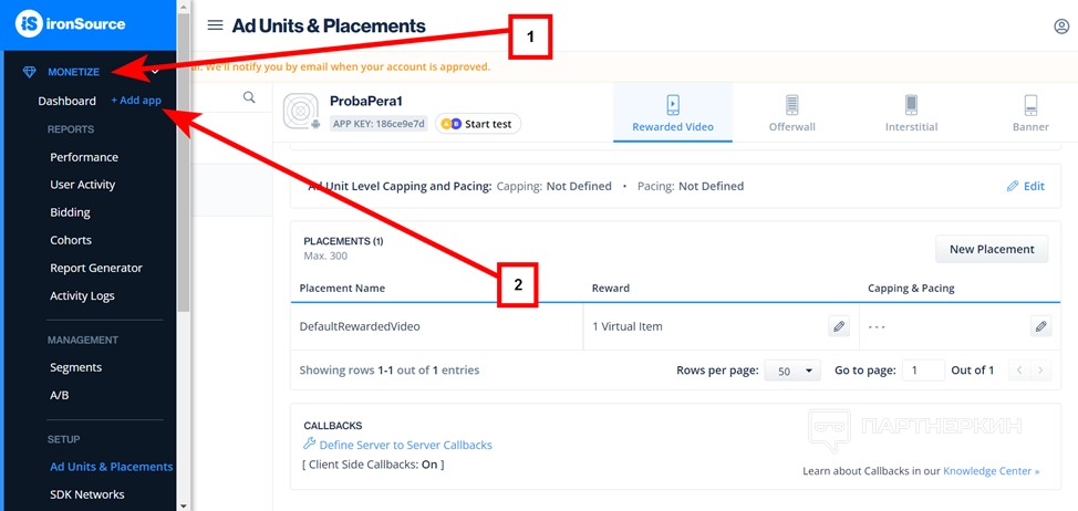 - Раскройте боковое меню и выберите вкладку MONETIZE (1). Нажмите на +Add app (2).