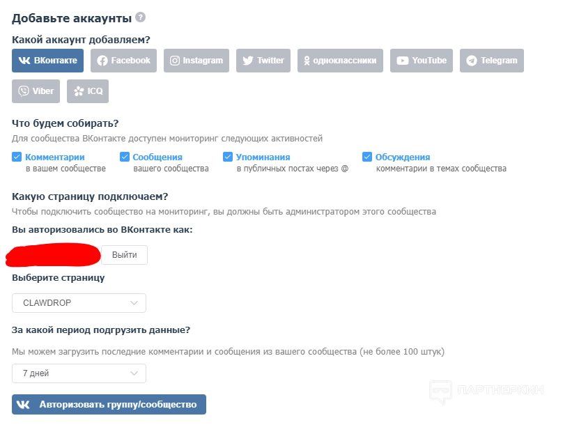 Чтобы подключить сообщество на мониторинг, пользователь должен быть администратором этой группы. Необходимо выбрать страницу и указать период, за который нужно подгрузить данные (например, 7 дней).