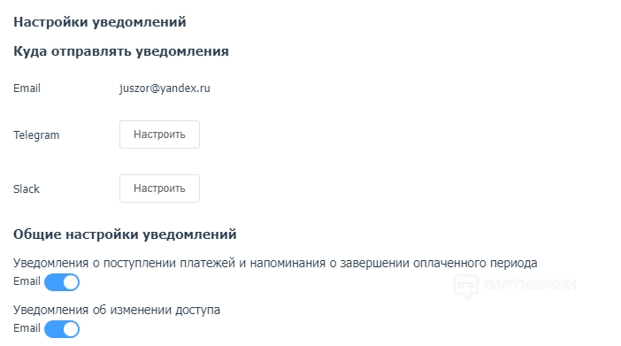 Уведомления могут приходить пользователю на электронную почту, Telegram или Slack. Во вкладке «Общие настройки уведомлений» можно включить/отключить две опции: