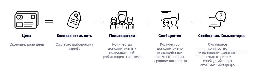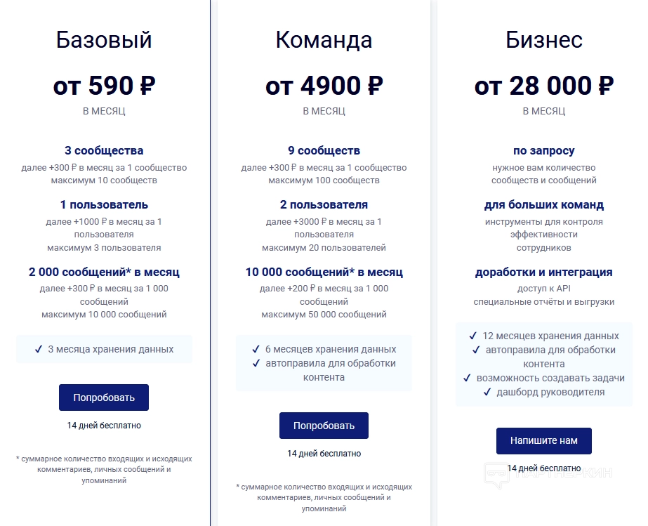 - Команда (от 4 900 рублей в месяц) . Доступно 9 сообществ, 2 пользователя и 10 000 сообщений в месяц.