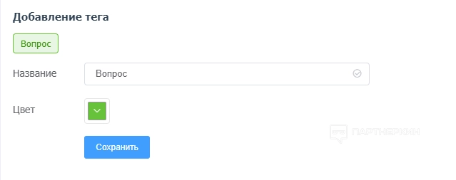 В окне «Добавление тега» необходимо указать название (например, вопрос или благодарность), выбрать цвет и нажать «Сохранить».