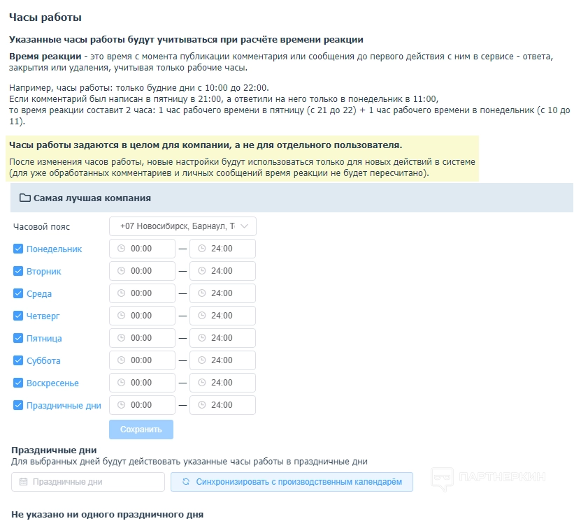В этом разделе может установить часы работы. Они задаются в целом для компании, а не для отдельного пользователя. После изменения часов работы обновленные настройки будут использоваться только для новых действий в системе.
