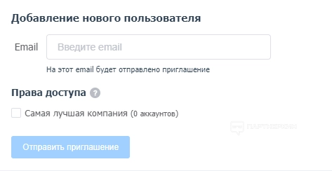 На новой странице нужно ввести адрес электронной почты (на него будет отправлено приглашение) и установить права доступа (новый пользователь получит доступ к выбранным компаниям, как только подтвердит свой email).