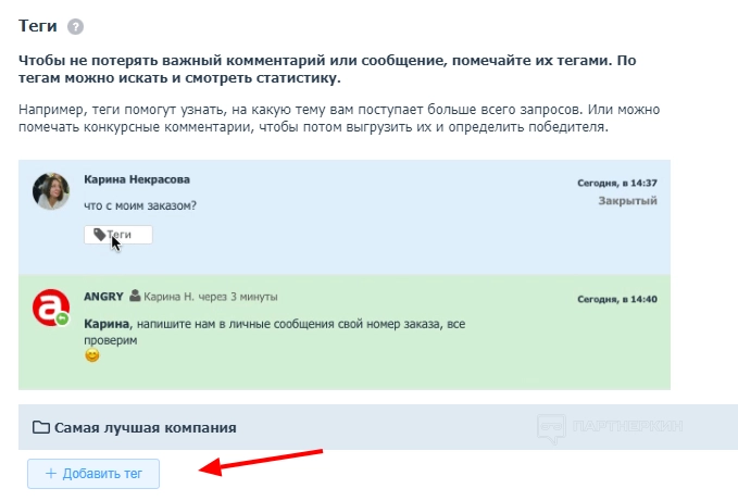 Тег — это метка для тематического группирования информации. Чтобы не потерять важный комментарий или сообщение, необходимо помечать их тегами. По ним можно искать и смотреть статистику. Метки помогут узнать, на какую тему поступает больше всего запросов (еще можно помечать конкурсные комментарии, чтобы потом удобно выгрузить их и определить победителя).