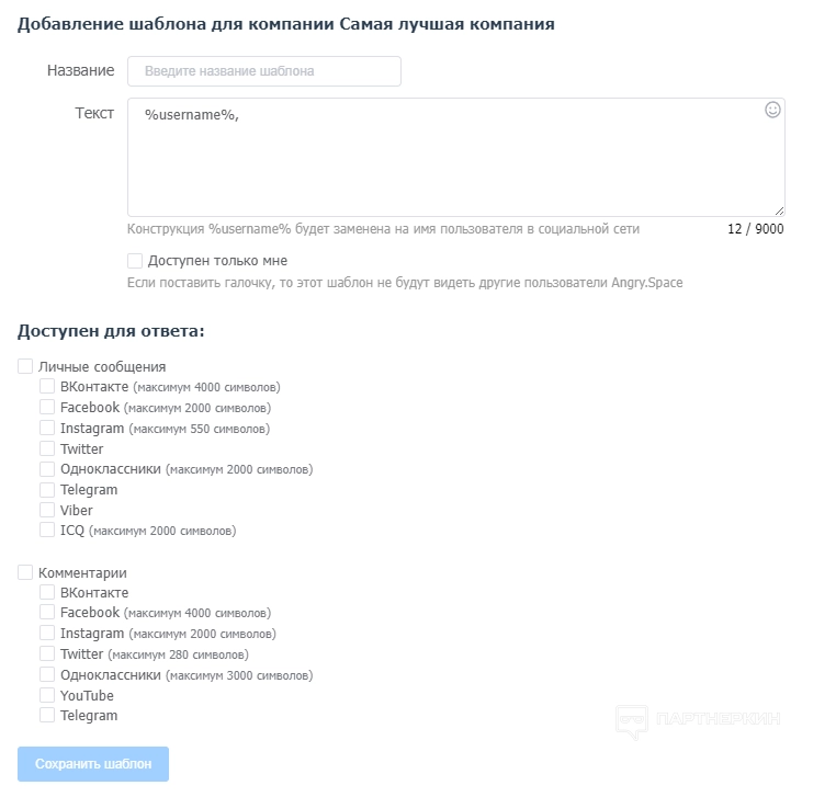 Откроется вкладка «Добавление шаблона». Здесь нужно ввести название, текст (до 9 000 символов), включить/отключить опцию «Доступен только мне» (если поставить галочку, шаблон не будет отображаться другим пользователям сервиса