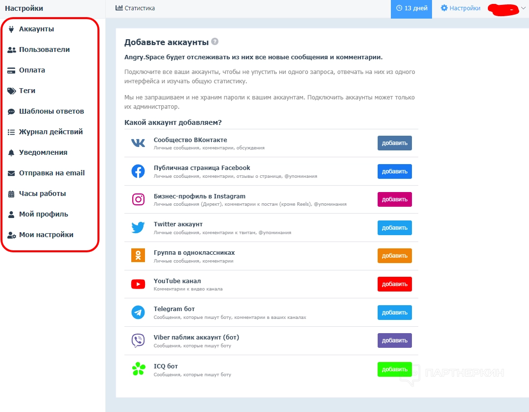 Следующий шаг — добавить аккаунты. Angry.Space будет отслеживать из них все новые сообщения и комментарии. Платформа не запрашивает и не хранит пароли к профилям.