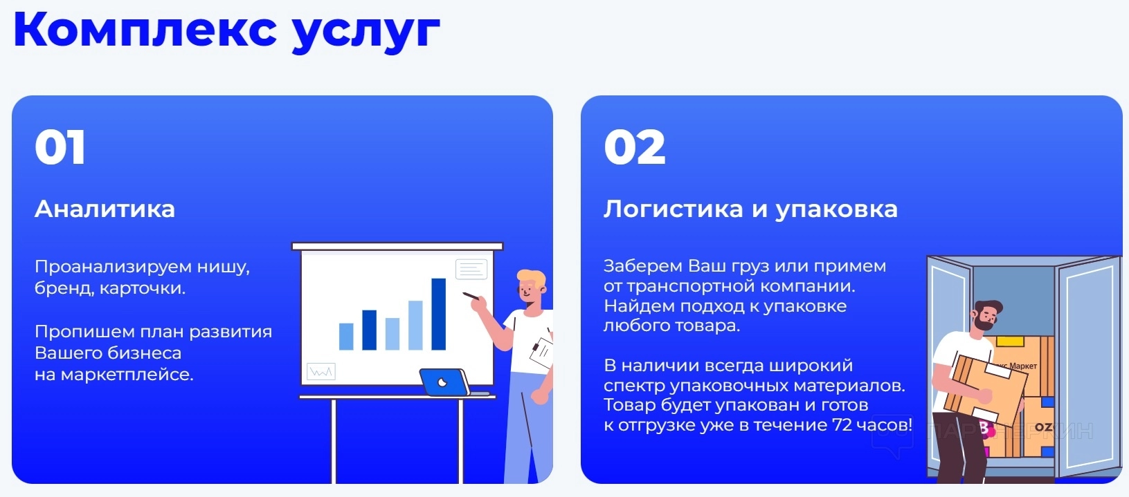 - Сервис предоставляет полный цикл услуг для работы с маркетплейсами.