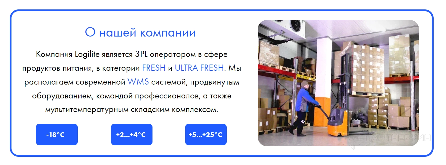 - В зависимости от температурного режима хранения на складе присутствуют сразу три профильные зоны: -18 градусов, +2...+4 градуса и +5...+25 градусов соответственно.