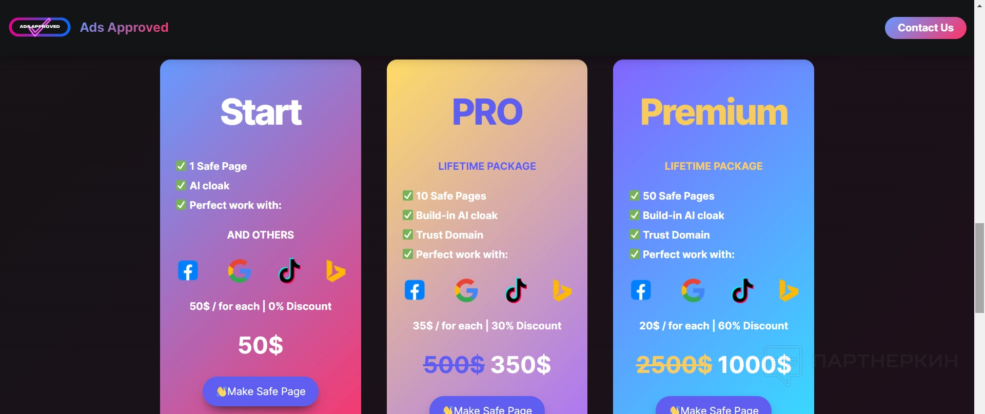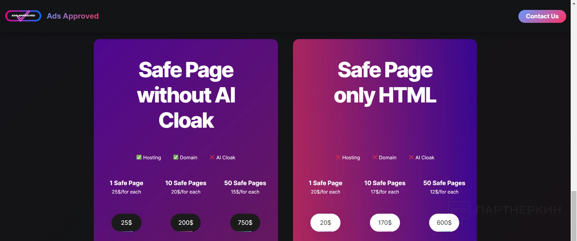 Помимо этого пользователи могут воспользоваться и другими предложения платформы. Например, можно оформить Safe Page without AI Cloak. В таком случае пользователь может приобрести все инструменты без клоаки, а также создать выбранное им количество вайтов: 1 вайт-страница за 25 USD, 10 за 20 USD за одну,  50 за 15 USD за одну. При этом входит сюда хостинг и  домен.