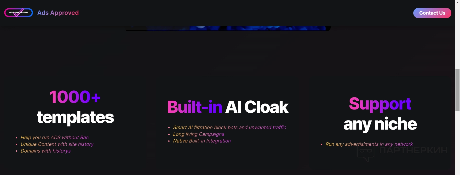 2. Встроенная AI клоака для обхода блокировок — наличие встроенной AI клоаки обеспечивает возможность обхода блокировок и фильтров, установленных рекламными платформами. Это позволяет показывать различный контент разным пользователям и предотвращать отклонения. Причем в тематике и направлении сервис никак не ограничивает.
