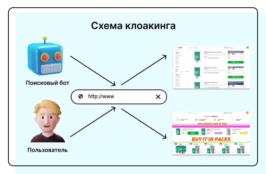 Клоакинг (cloaking) — это техника в области веб-маркетинга, при которой одна и та же веб-страница отображает разный контент для поисковых роботов и обычных пользователей. Основная цель клоакинга — обмануть поисковые системы и рекламные платформы, чтобы показывать контент, который может не соответствовать их правилам или рекомендациям, однако при этом предоставлять более привлекательный или целевой контент для конечных пользователей. Клоакинг может использоваться в различных целях, включая обход блокировок, улучшение конверсии и повышение эффективности рекламных кампаний.