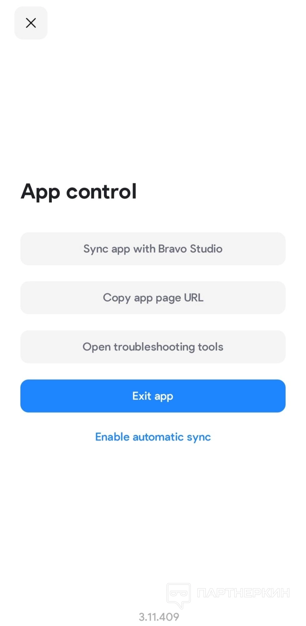 При заходе в созданное приложение, пользователь будет видеть его таким образом, как оно будет отображаться после скачивания. Долгое нажатие на экран открывает доступ к небольшой панели управления проектом. Здесь можно отследить некоторые свои действия внутри приложения (какие клики были совершены) или скопировать URL приложения. Выход из предпросмотра проекта осуществляется здесь же.