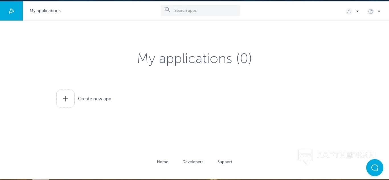 После регистрации личный кабинет профиля выглядит так. Большая часть пространства еще не заполнена лишней информацией или уже готовыми приложениями. Отсюда можно сразу отправиться создавать приложение путем нажатия на кнопку «Create new app» или погулять по настройкам кабинета: можно добавить банковские реквизиты своей карты для дальнейшей оплаты тарифов, поменять пароль или почту и так далее.