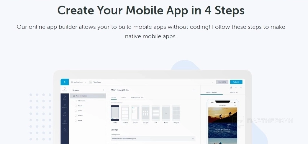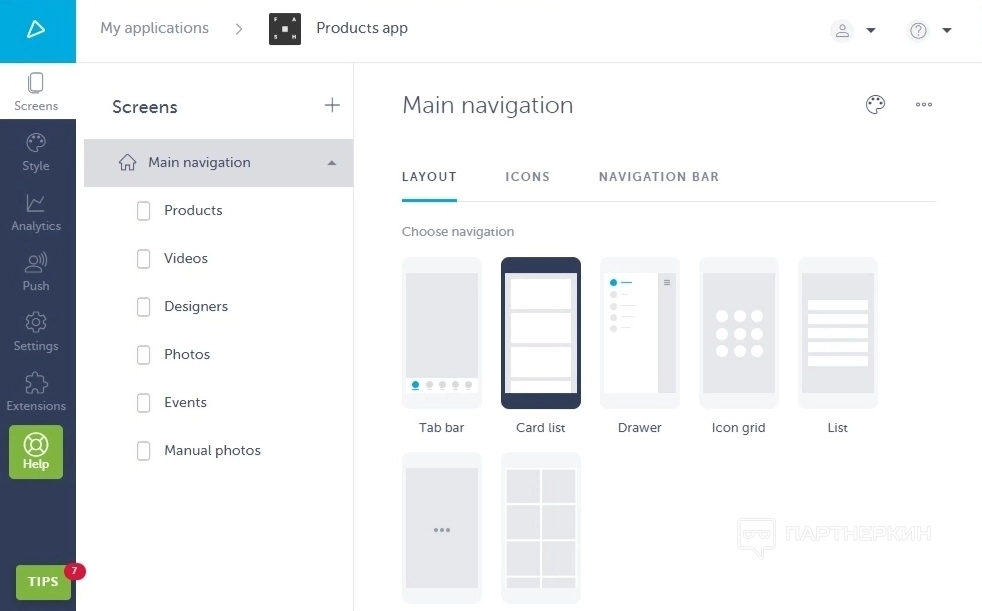 Первый раздел, который нужно настроить пользователю в совсем будущем приложении, это Экраны . По сути это те разделы, которые будет видеть будущий пользователь приложения. Здесь можно как удалять, так и добавлять дополнительные элементы, настраивать макет разделов, иконки, панель навигации, сам фон приложения. Нажимая на какой-то отдельный раздел, открывается редакция конкретно его (содержание, макет и так далее).