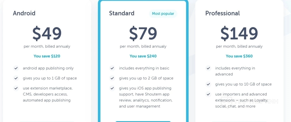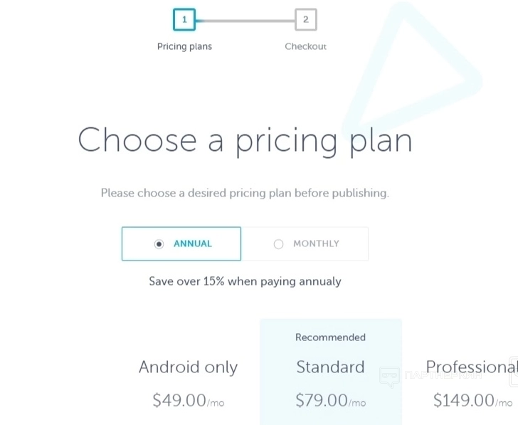 Выбирается тарифный план, вводятся банковские реквизиты и сразу оплачиваете подписку. После этого приложение отправляется в магазин.