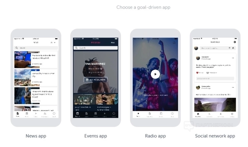 При создании приложения первым делом необходимо выбрать его шаблон из предложенных. Это может быть радио, новостная лента, социальная сеть, магазин и так далее.
