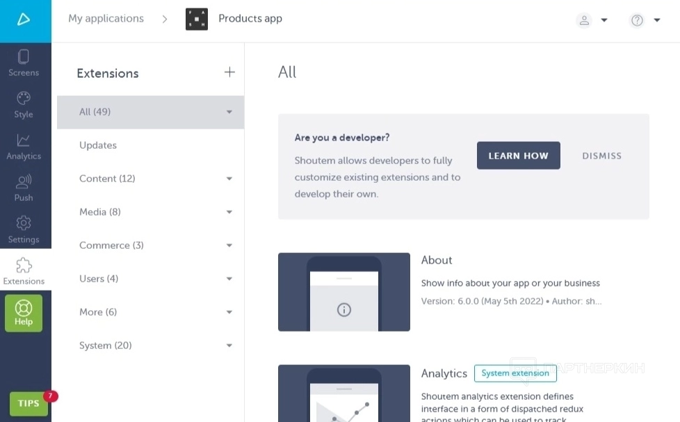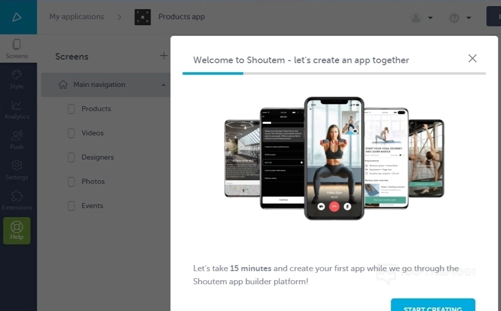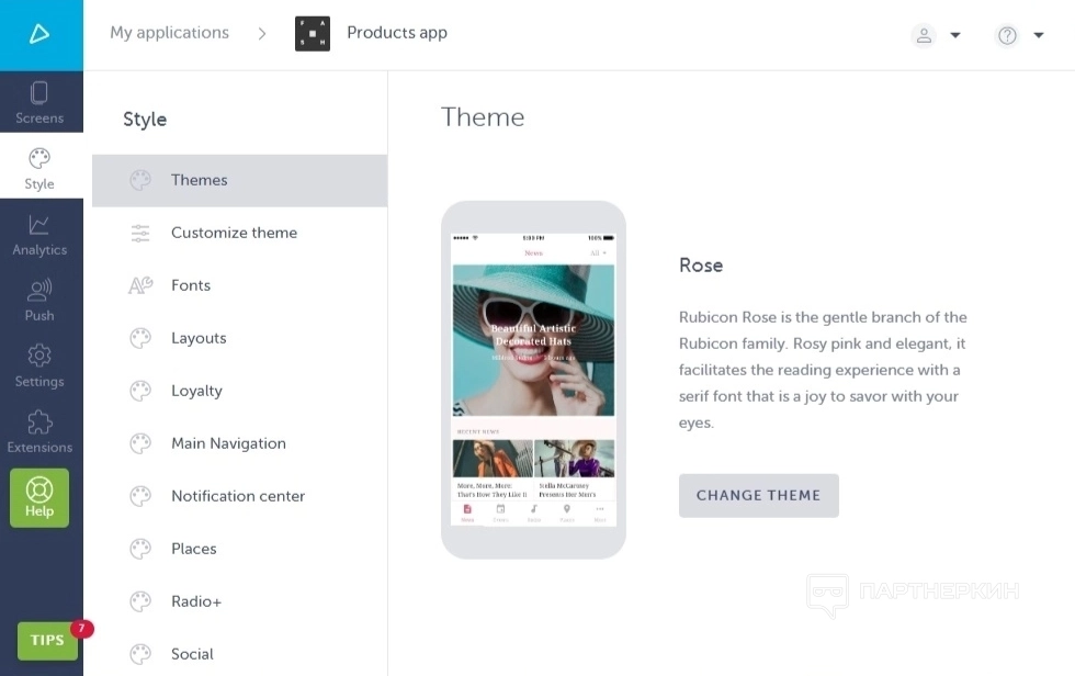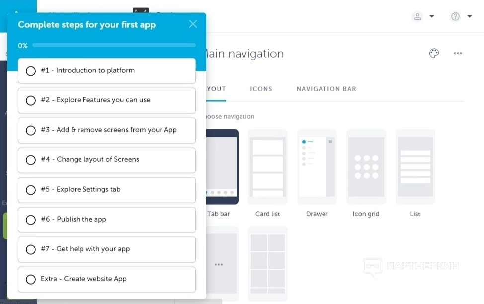 После выбора шаблона пользователь попадает в кабинет настройки приложения. Сразу же сервис предлагает пройти обучение для ознакомления с конструктором, состоящее из 7 пунктов, перечисленных в меню слева.