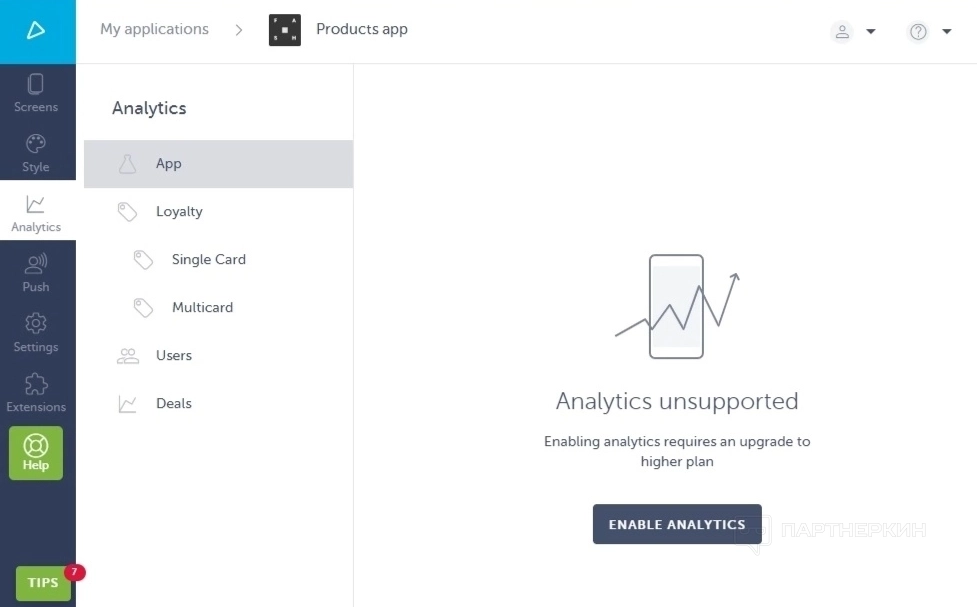 Раздел Аналитика будет доступен уже после публикации приложения в магазине приложений. Здесь будут отображаться данные о количестве посетителей, их качество (просто посмотрели, установили или начали пользоваться), а также общая статистика по установкам и популярности.