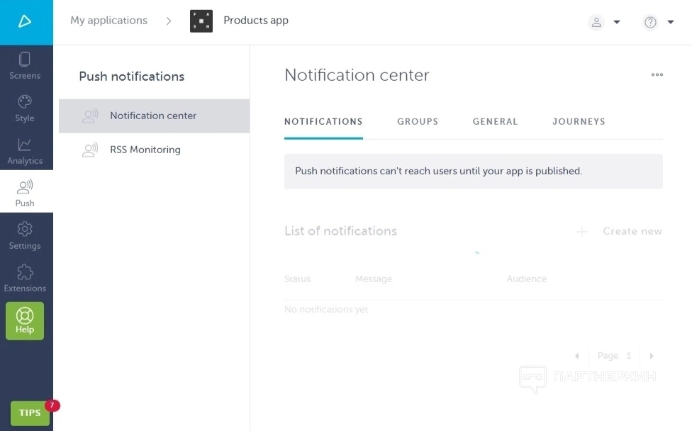 Следующий раздел — Уведомления . Здесь происходит настройка уведомлений внутри приложения. Можно прописать уведомления для каждого предполагаемого действия будущего пользователя, например уведомление для оповещения об акциях и другие.