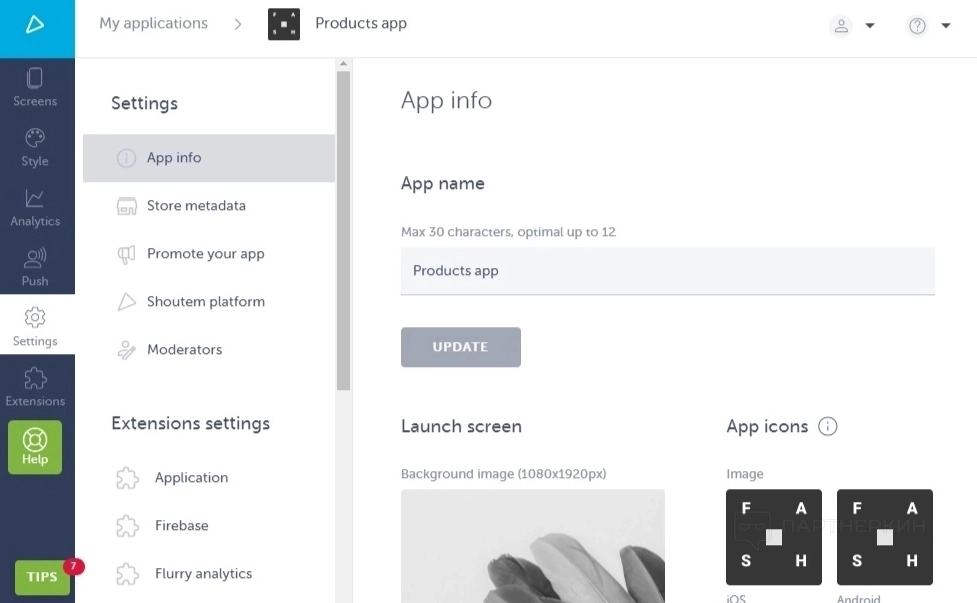 Предпоследний раздел — Настройки . Здесь настраиваются общие данные о приложении: имя, иконка приложения в магазине, как оно будет продвигаться и так далее.