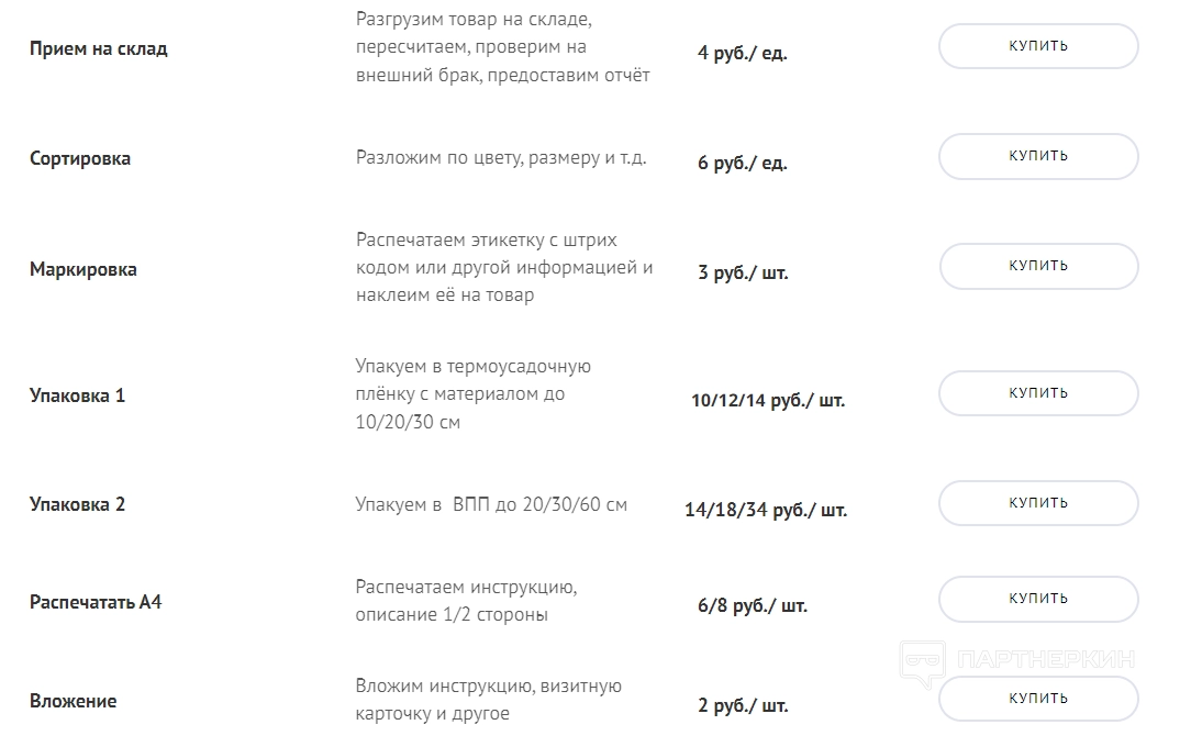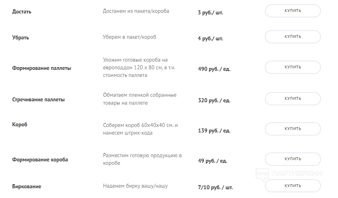 Цены на фулфилмент зависят от услуг, которые заказывает клиент. Некоторые тарифы: