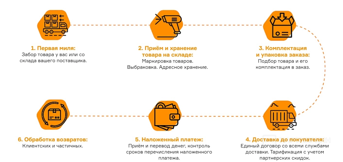 Компания Betapro разработала готовое логистическое решение для интернет-продавцов. Оно включает в себя 6 этапов: