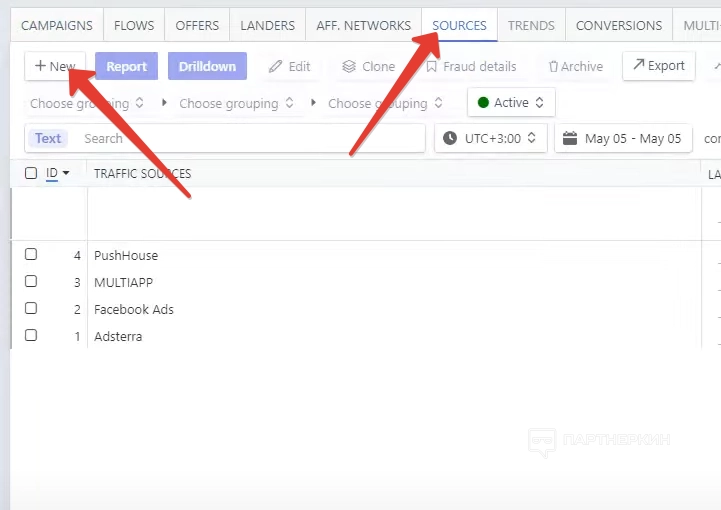 Следующий этап — добавление источника трафика. Чтобы добавить источник, переходим во вкладку «Источники» и жмем на кнопку «Новый».