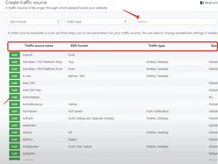 Далее откроется окно со списком, где будут все поддерживаемые рекламные сети. В окне есть система фильтрации, распределяющая сети по названию, формату рекламы типу трафику и ГЕО. В верхней части предусмотрена поисковая строка. Чтобы добавить рекламную сеть, просто кликаем на кнопку «Добавить» и настраиваем макросы.