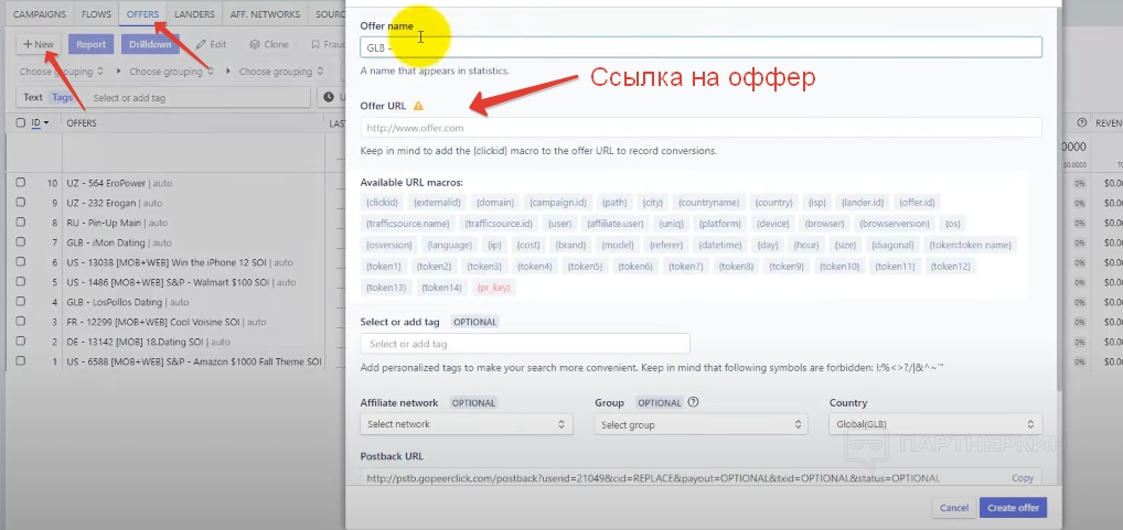 Для добавлению офферов переходим в раздел «Офферы», жмем на кнопку «Новый» и заполняем форму. Форма заполняется по той же схеме, как при настройке преленда. Учтите, что ссылку на оффер нужно будет скопировать их личного кабинета в выбранной партнерской программе.
