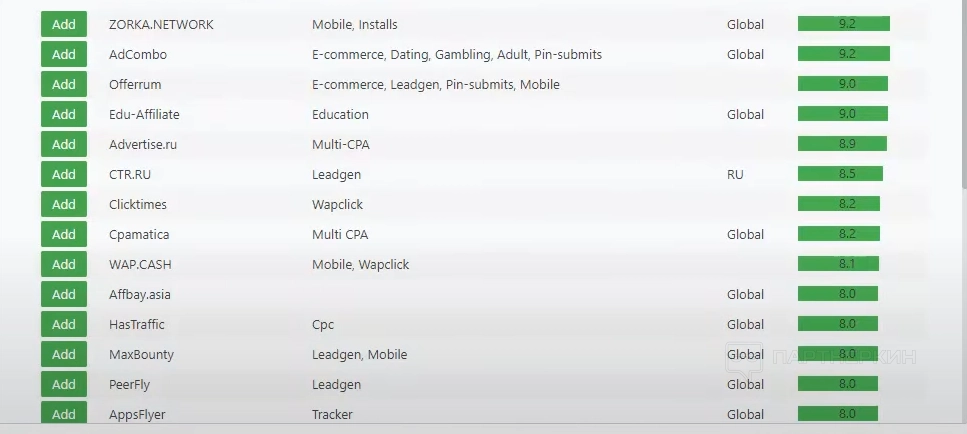Как и в предыдущем случае, откроется специальная форма с перечнем доступных партнерок, распределенных по названию, направлению (лендинги, мобайл, инсталлы и т.д.), ГЕО и рейтингу. При добавлении партнерки откроется окно, где вебмастер найдет postback URL и ссылку с clickid.
