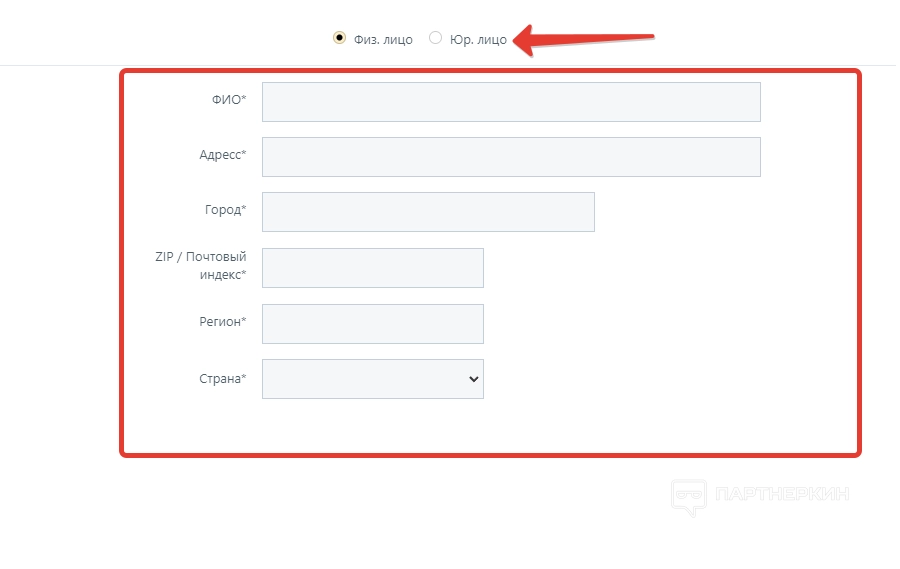Если пользователь выберет статус «Юридическое лицо», еще потребуется указать название компании и VAT/TAX ID.